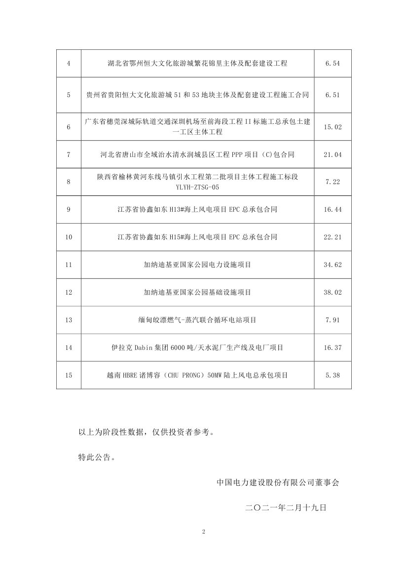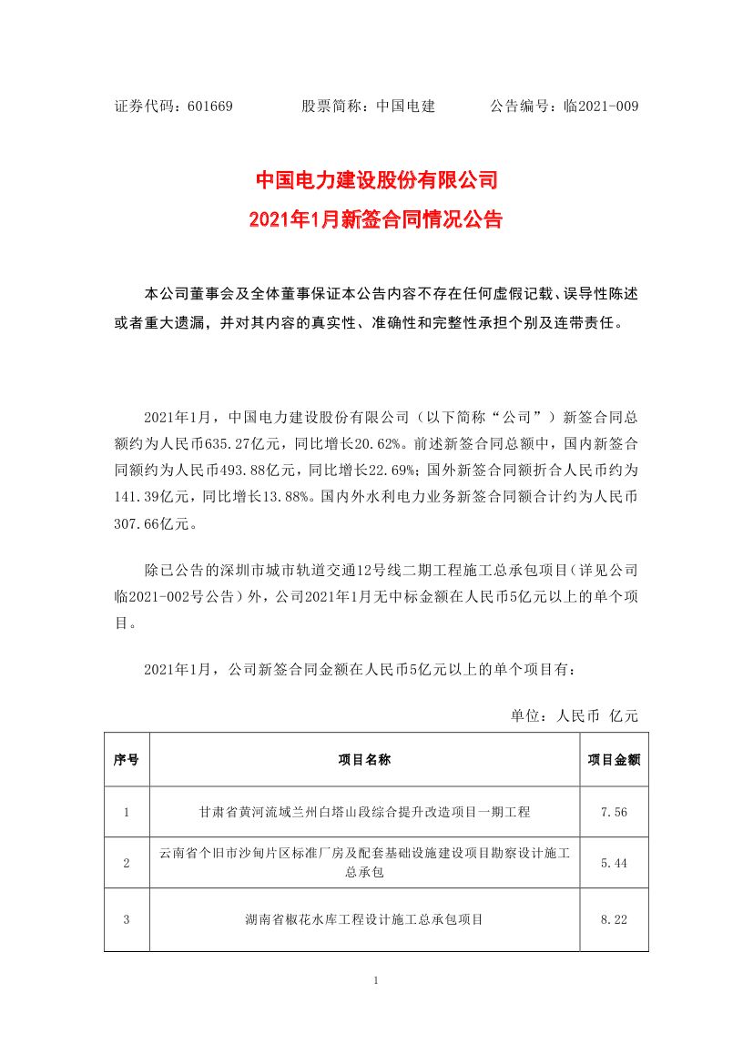 2021年1月,中国电建(以下简称“公司”)新签合同总额约为人民币635.27亿元,同比增长20.62%。前述新签合同总额中,国内新签合同额约为人民币493.88亿元,同比增长22.69%;国外新签合同额折合人民币约为141.39亿元,同比增长13.88%。国内外水利电力业务新签合同额合计约为人民币307.66亿元。