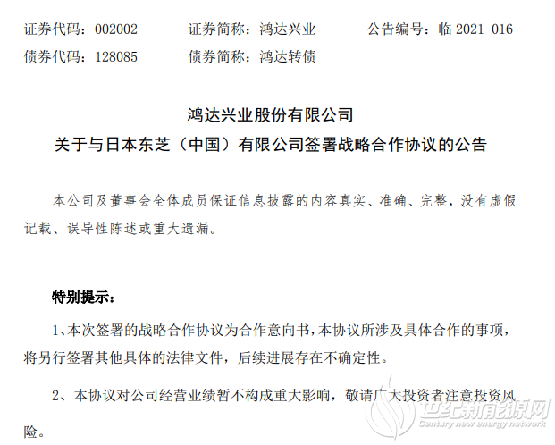 2月23日,鸿达兴业发布公告称,其与日本东芝(中国)有限公司签署战略合作协议。