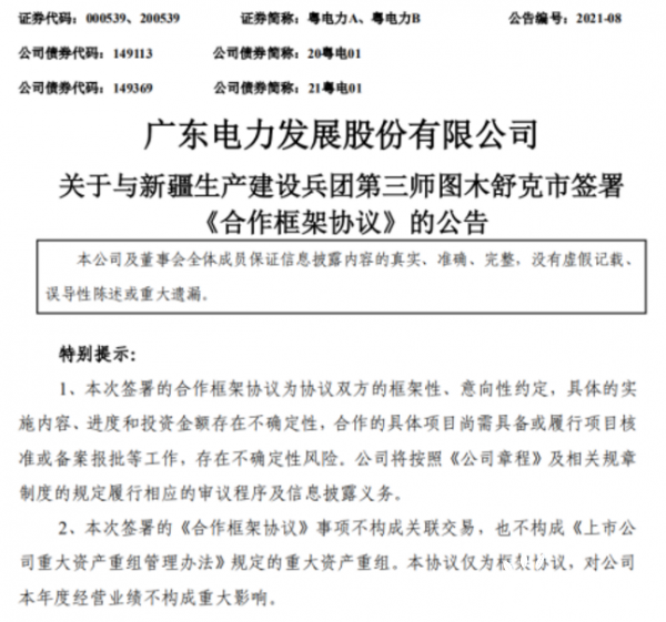 尽管如此,粤电力要斥资105亿在新疆建设风电光伏项目,需要警惕财务的风险,目前公司的负债率水平在56.84%,处于中等负债水平。截至2020年9月,公司的投资净现金流为-49.19亿,从2015年到2019年,该公司的投资产生的净现金流均为负数,平均为-37亿元,说明此前粤电力在投资方面处于付出阶段,尚未实现投资回报,再持续投资,可能会让投资带来一定的资金压力。该公司的现金及现金等价物净增加额截至到2020年9月,依然是-4.907亿,如果粤电力想要实现此次签署的合作协议,需要加大融资的力度,防范财务风险。